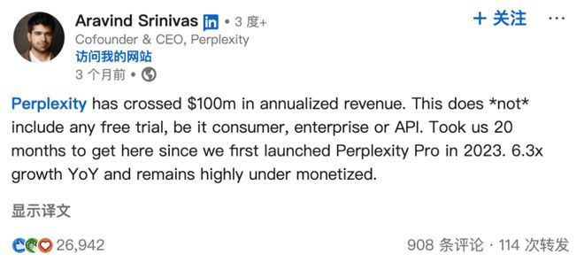 同样是依靠付费会员,Perplexity AI 的创始人 Aravind Srinivas 三个月前就表示,Perplexity 的年化收入已突破 1 亿美元,并称仍有很大变现空间。