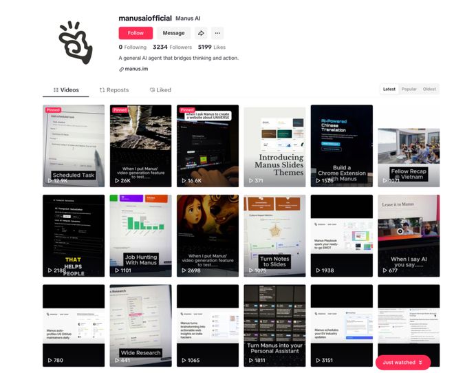 倒不是说 Manus 不重视社媒传播。对于一家面向 C 端用户的 AI 应用公司来说,社媒宣传是重中之重,只是 Manus 的所有宣传重心都放在了海外。比如他们从未在抖音上发布视频,但过去 4 个月来在 TikTok 上发布了近 80 条短视频、在 YouTube 上发布了 33 条宣传片。